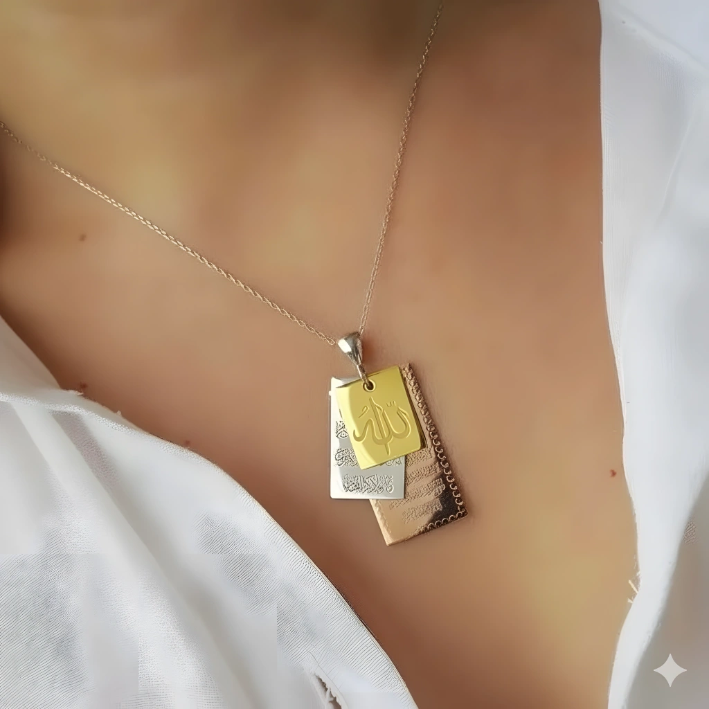 Üçlü Manevi Güç: Kolye ucu, inancın temeli olan Allah Lafzı, koruyucu ve bereketli olan Ayetel Kürsi ve kötü enerjilere karşı siper olan Nazar Duası'nı zarif bir işçilikle buluşturur.