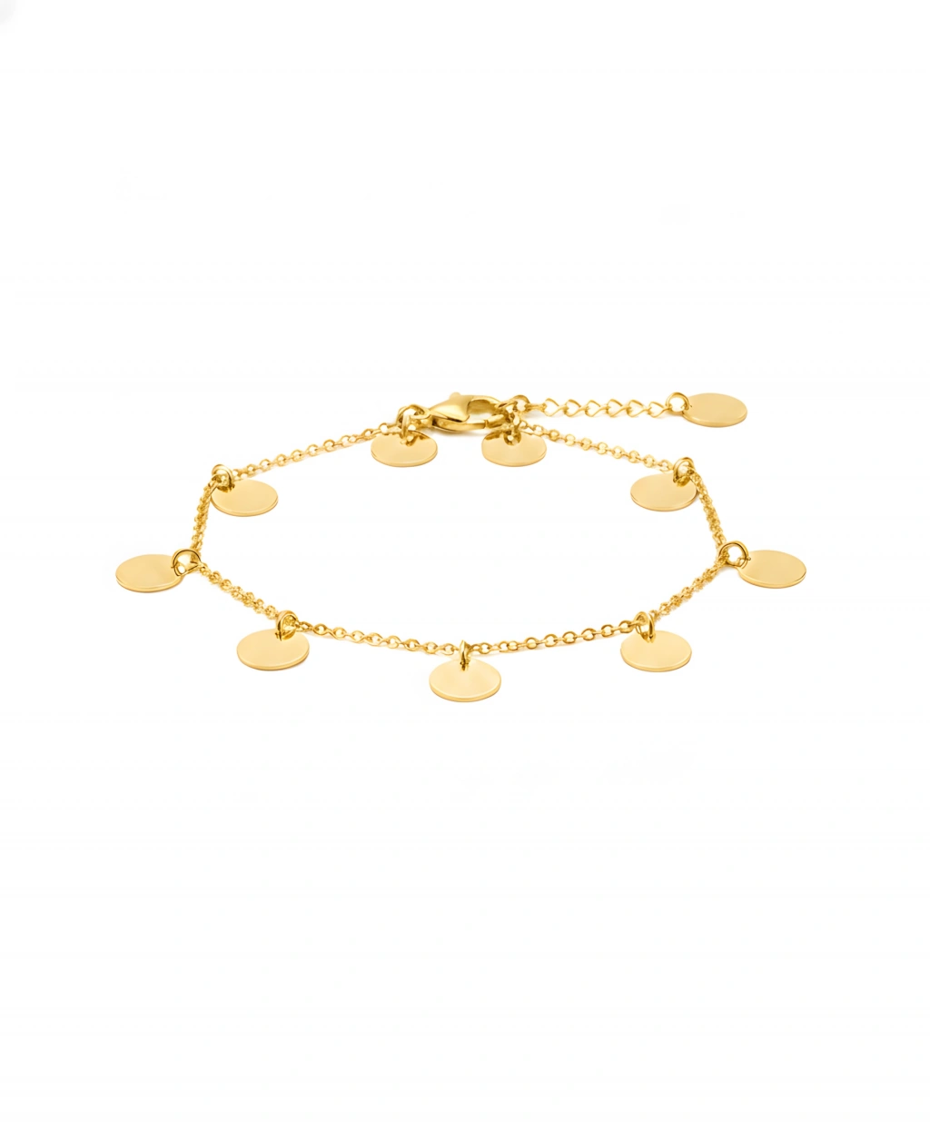 Ayarlanabilir zincir yapısı sayesinde her bilek ölçüsüne uyum sağlayan bu halhal, ister tek başına ister diğer aksesuarlarınızla kombinleyerek kullanabileceğiniz çok yönlü bir parçadır. Işığı yansıtan zarif disk detayları, ayak bileğinizde hareketli ve büyüleyici bir etki yaratır.