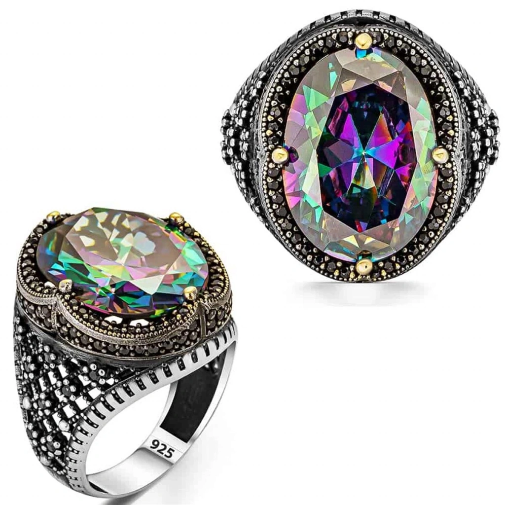 Renklerin Büyüsü: Mistik Topaz Taşlı Motif İşlemeli Gümüş Erkek Yüzük