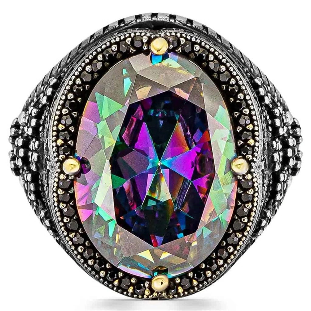 Ana Taş: Gökkuşağı efektli, yüksek kaliteli faset kesim Mistik Topaz taşı.