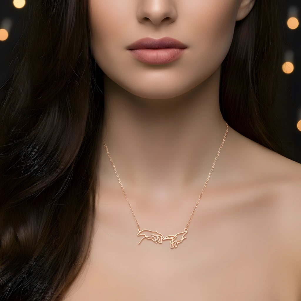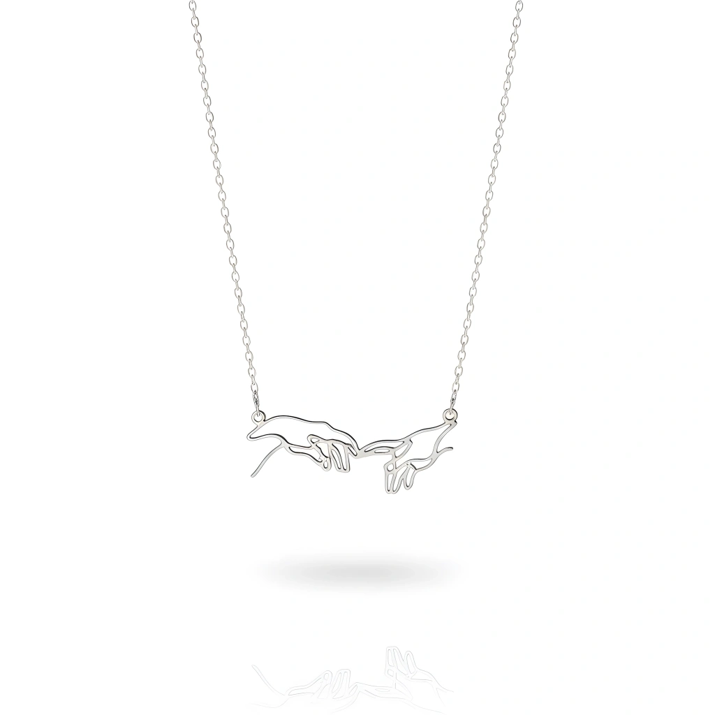 Michelangelo'nun ünlü "Adem'in Yaratılışı" tablosundan ilham alan bu özel tasarım gümüş kolye, iki elin buluştuğu o büyülü anı, zarif bir sanat eseri olarak boynunuza taşıyor. Aşkın, bağlılığın, dostluğun ve insanlık bağının en güçlü sembollerinden biri olan bu kolye, duygularınızı en şık şekilde ifade etmenizi sağlar. İster kendinize ilham verici bir sembol olarak, ister sevdiklerinize derin anlamlar taşıyan bir hediye olarak tercih edin, bu kolye her zaman özel kalacak.