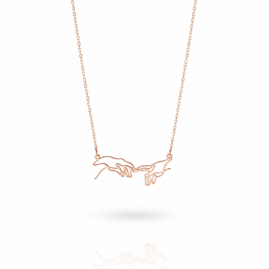 Michelangelo'nun ünlü "Adem'in Yaratılışı" tablosundan ilham alan bu özel tasarım gümüş kolye, iki elin buluştuğu o büyülü anı, zarif bir sanat eseri olarak boynunuza taşıyor. Aşkın, bağlılığın, dostluğun ve insanlık bağının en güçlü sembollerinden biri olan bu kolye, duygularınızı en şık şekilde ifade etmenizi sağlar. İster kendinize ilham verici bir sembol olarak, ister sevdiklerinize derin anlamlar taşıyan bir hediye olarak tercih edin, bu kolye her zaman özel kalacak.