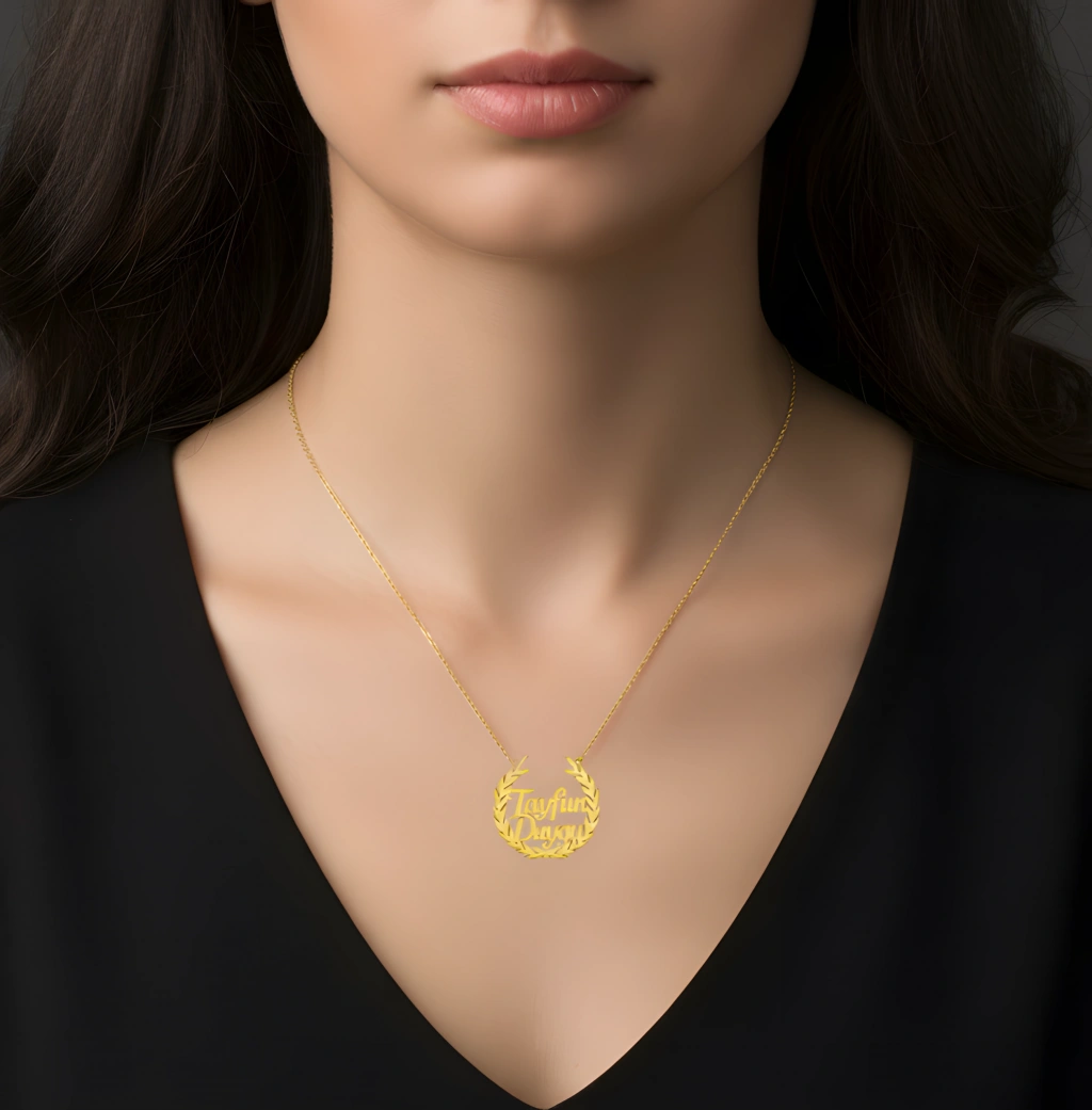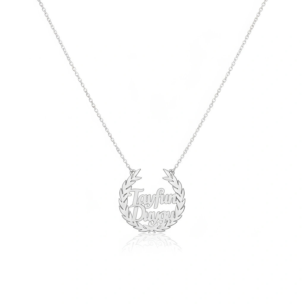 Ürün Açıklaması: Zaferin ve sonsuzluğun sembolü olan defne yaprakları içinde, sevdiklerinizin isimlerini taşıyın! ✨ Bu özel gümüş kolye, narin defne çelengi tasarımıyla zarafeti ve kişiselleştirmeyi bir araya getiriyor. "Tayfun" ve "Duygu" gibi anlamlı isimlerinizi bu eşsiz tasarımda ölümsüzleştirin.