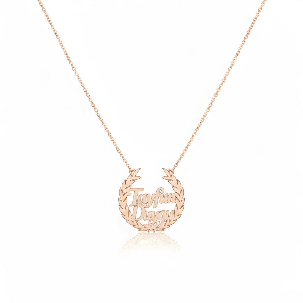Ürün Açıklaması: Romantik bir dokunuşla sevdiklerinizin isimlerini onurlandırın! ? Bu zarif roze defne yapraklı kolye, "Tayfun" ve "Duygu" gibi isimleri roze renginin sıcaklığı ve defne çelenginin asil zarafetiyle birleştiriyor. Modern ve feminen tarzın mükemmel bir ifadesi.