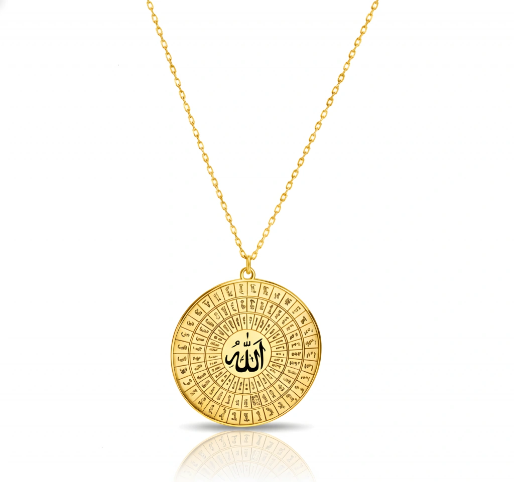 Kolye, yüksek kaliteli 925 Ayar Gümüşten özenle üretilmiştir. Görseldeki gibi Gümüş Rengi veya Rose Altın Kaplama seçenekleri ile sunulur. Madalyonun merkezinde, koyu ve belirgin bir yazı stiliyle "Allah" lafzı yer alır. Bu merkez lafız, etrafındaki halkalarda ise 99 ismin tamamını içeren ince ve sanatsal bir hat çalışmasıyla çevrelenmiştir.