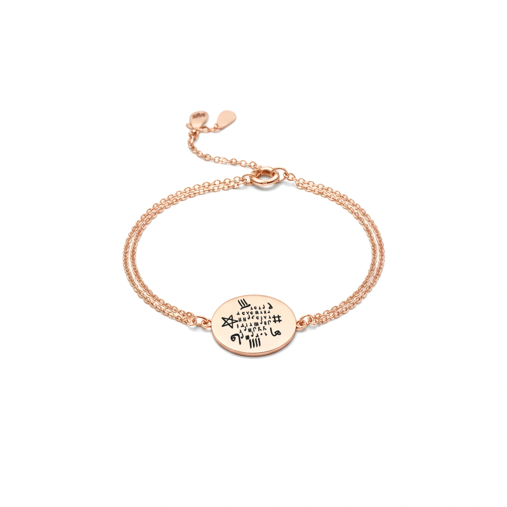 Özenle tasarlanmış semboller, bilekliğe modern ve anlamlı bir hava katarken, çift sıra zincir detayıyla da estetik bir dokunuş sunar. Hafif yapısı sayesinde gün boyu konforlu bir kullanım sunan bu bileklik, özel zincir kilidiyle de güvenliğinizi sağlar.