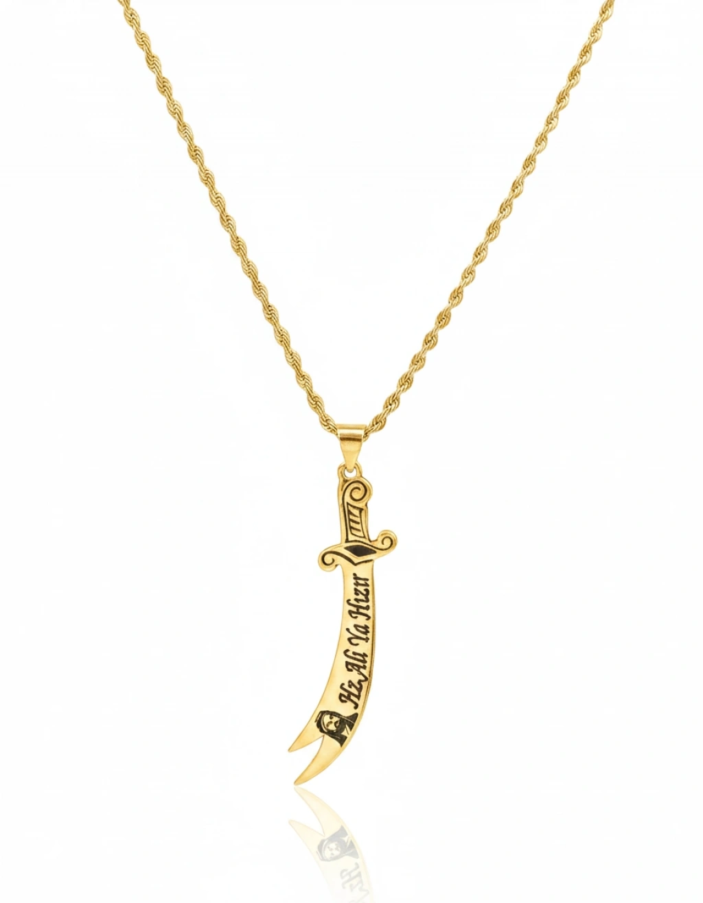 • Anlamlı Gümüş Uç: Kolye ucu, 925 ayar gümüşün titizlikle işlenmesiyle hazırlanmış ve altın kaplama ile parlak bir görünüm kazanmıştır. Üzerinde yer alan (muhtemelen "Hz. Ali Ya Hazır" veya "Lâ Fetâ İllâ Ali, Lâ Seyfe İllâ Zülfikâr" sözüne atıf yapan) yazılı metin ve kılıcın alt kısmındaki Hz. Ali silüeti detayı, kolyeye benzersiz bir manevi derinlik katmaktadır.