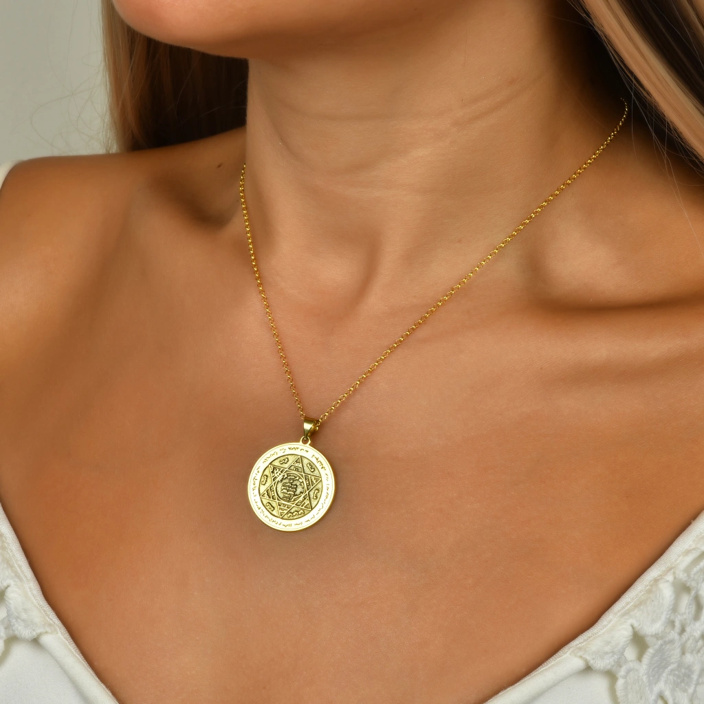 Bu eşsiz kolye, hem günlük kullanımınızda size manevi bir yoldaşlık edecek hem de özel günlerinizde stilinize derin bir anlam katacaktır. İnce gümüş zinciriyle birlikte gelen bu kolye, zarif tasarımıyla her türlü kıyafetle uyum sağlar. Kendinize veya sevdiklerinize anlamlı ve güçlü bir hediye vermek istiyorsanız, bu Mühr-ü Süleyman kolye mükemmel bir seçim olacaktır.