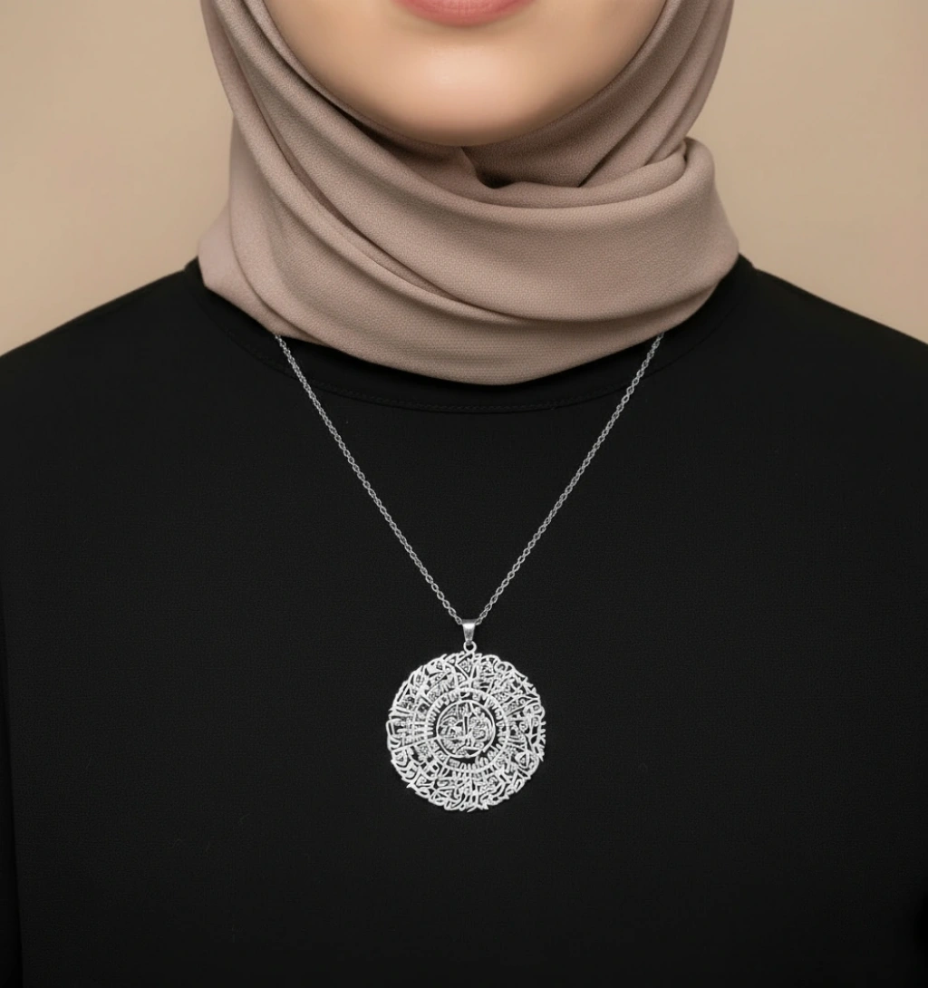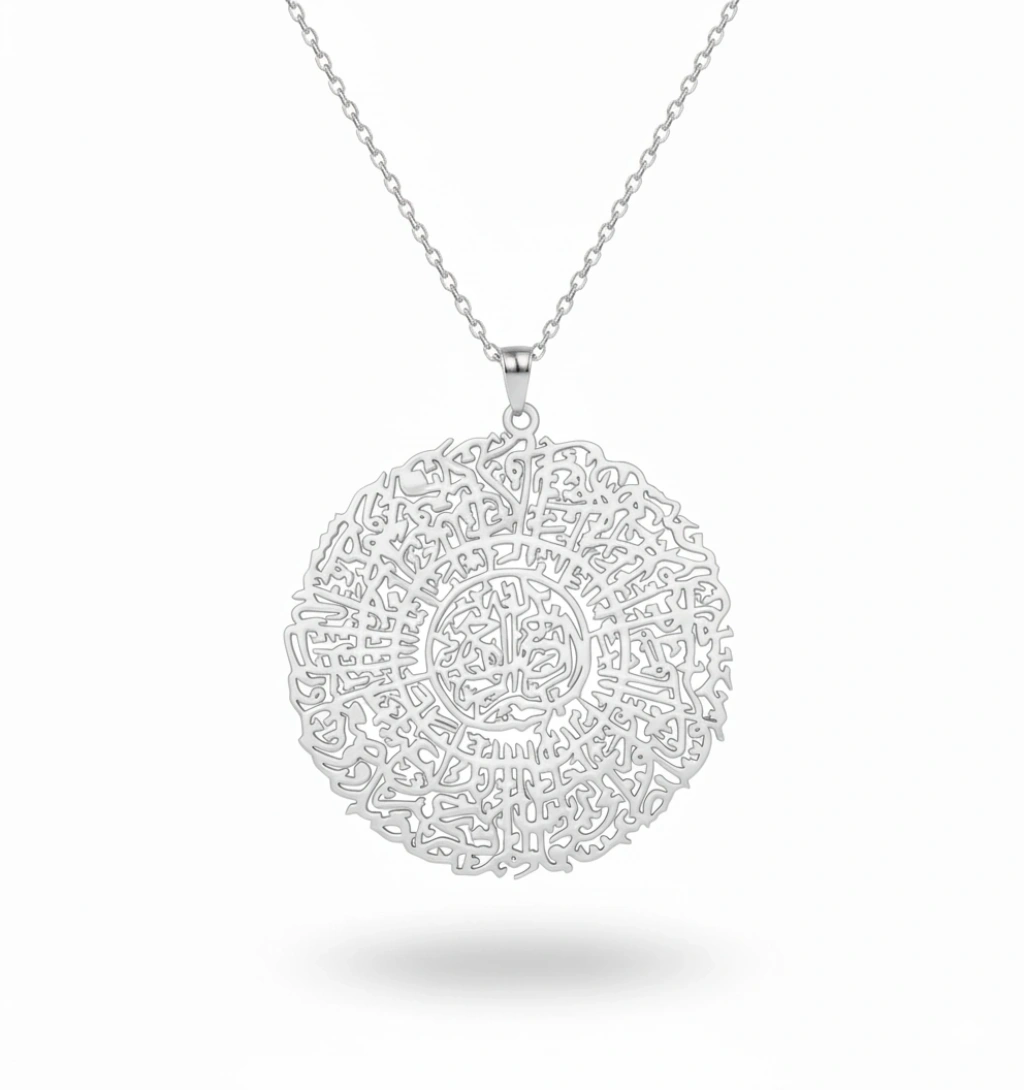 • Zarif Tasarım: İnce işçilikle yuvarlak formda işlenmiş sure metni, göz kamaştırıcı bir desen oluşturur. Her bir harf, adeta bir sanat eserini andırır.