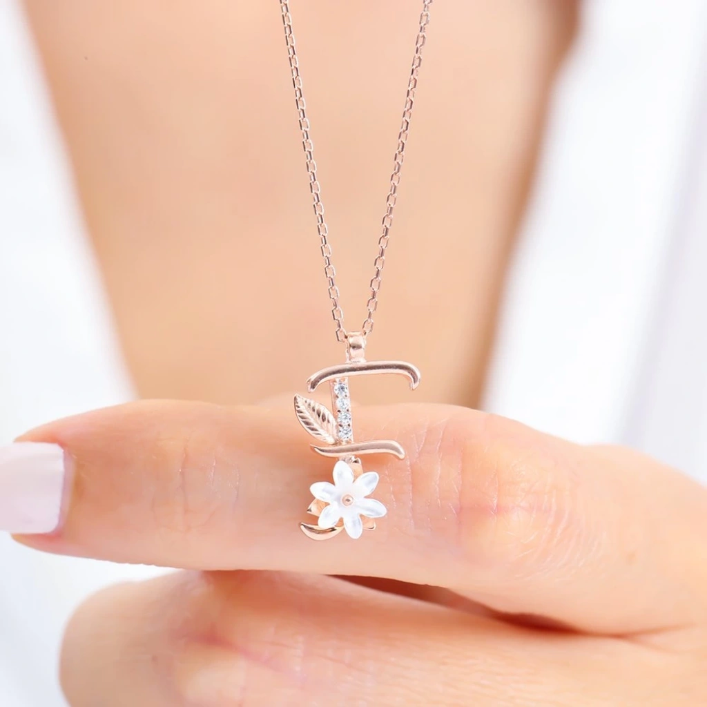 Işıltılı Manolya Çiçeği F Harfi Gümüş Harfli Kolye