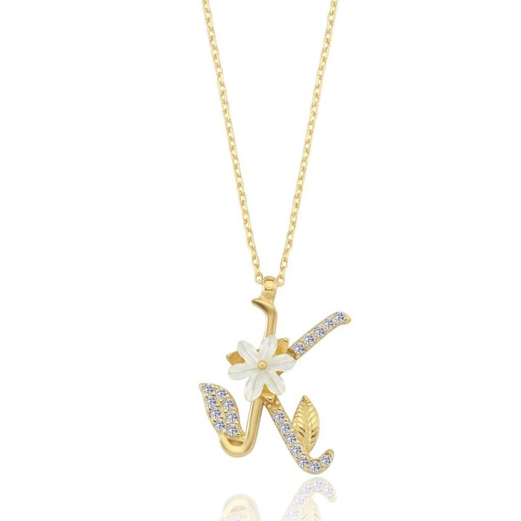 Işıltılı Manolya Çiçeği K Harfi Gümüş Harfli Kolye - Altın