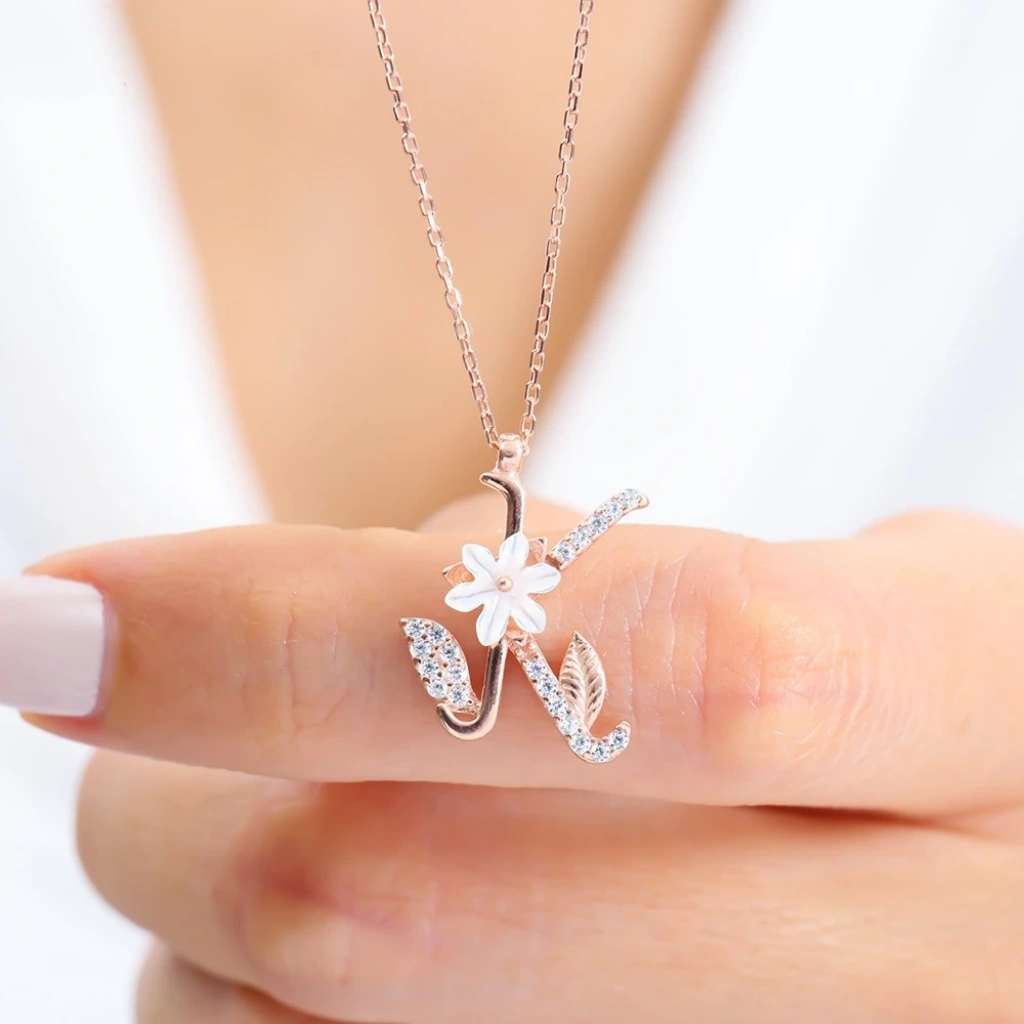 Işıltılı Manolya Çiçeği K Harfi Gümüş Harfli Kolye