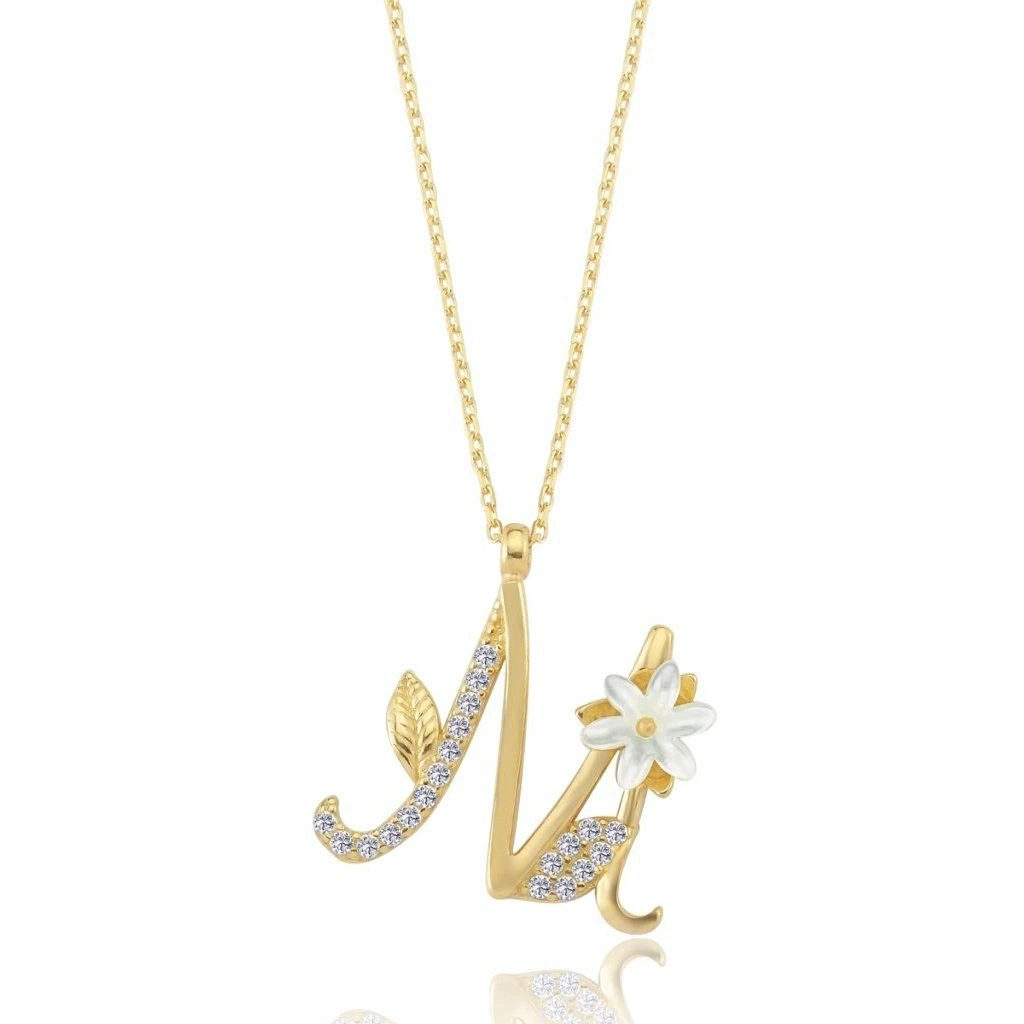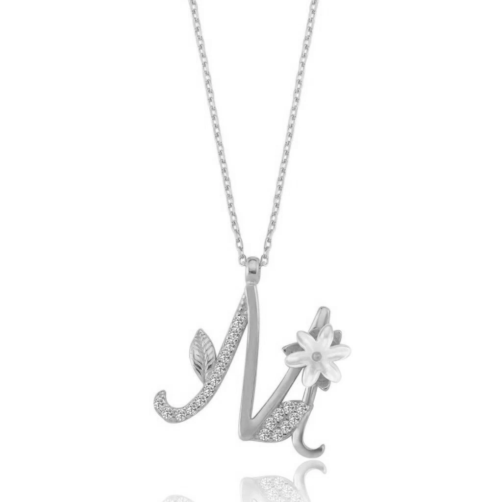 Işıltılı Manolya Çiçeği M Harfi Gümüş Harfli Kolye