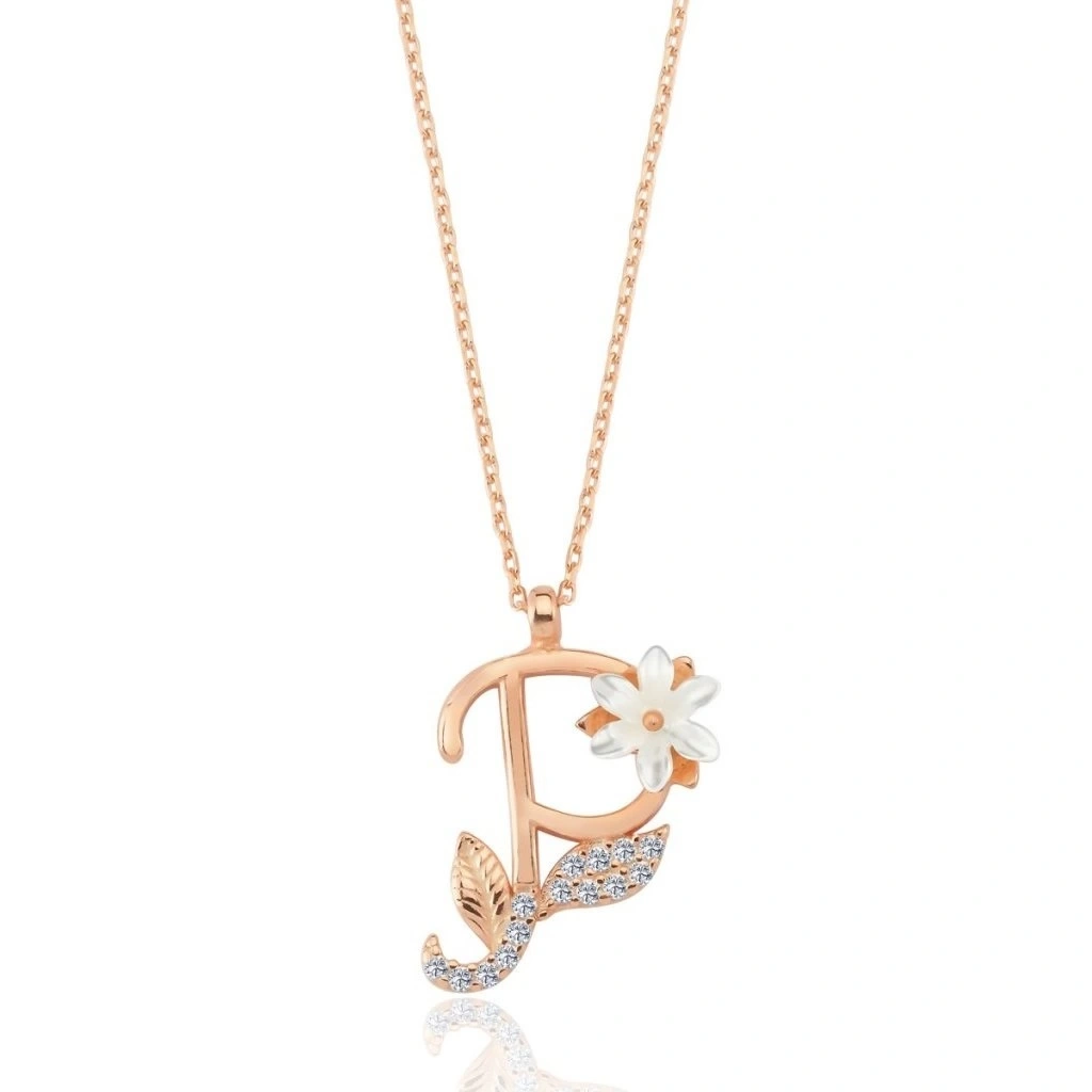 Işıltılı Manolya Çiçeği P Harfi Gümüş Harfli Kolye - Rose