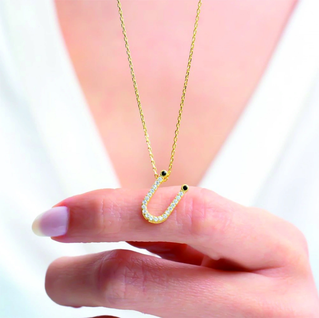 Işıltılı Prizma Ü Harfi Gümüş Kolye - Altın