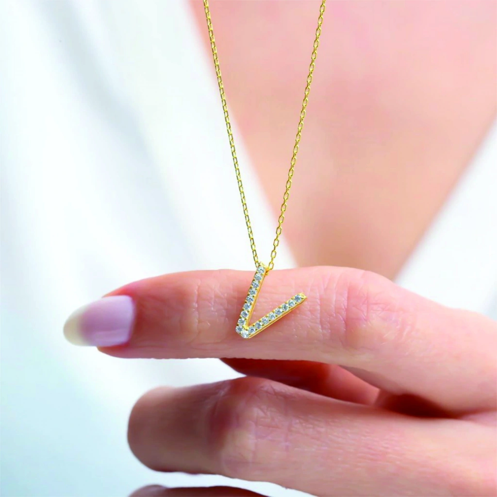 Işıltılı Prizma V Harfi Gümüş Kolye