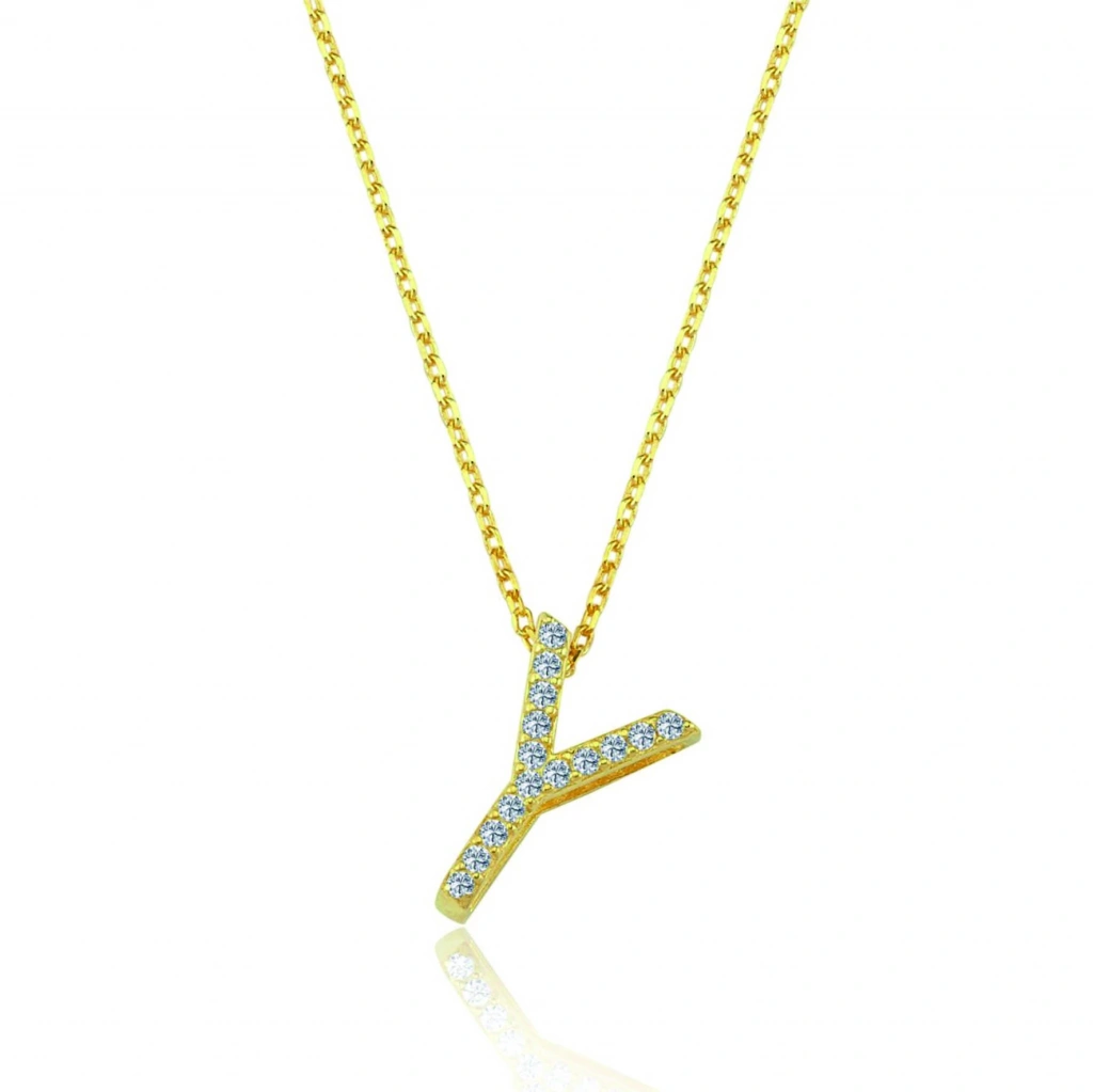 Işıltılı Prizma Y Harfi Gümüş Kolye - Altın