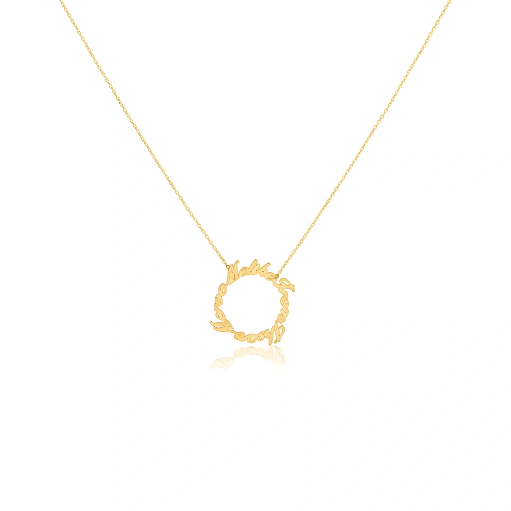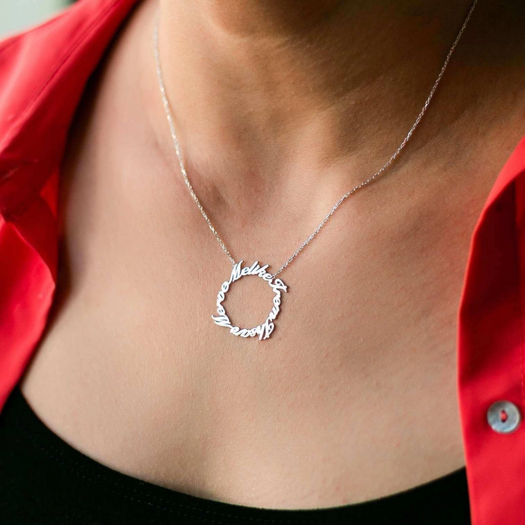 Sevdiklerinizin isimlerini daima kalbinize yakın taşıyın! Bu özel tasarım Kişiye Özel İsim Yazılı Halka Gümüş Kolye, sizin veya sevdiklerinizin isimlerini zarif bir daire formunda bir araya getirerek, anlam dolu ve şık bir aksesuar sunuyor. Her bir ismi özenle işlenmiş bu kolye, kişisel hikayenizi en özel şekilde yansıtacak.