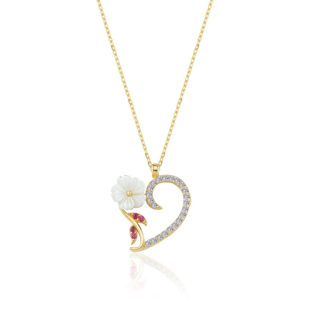 Kalp Demeti Manolya Çiçeği Flowers Gümüş Kolye - Altın