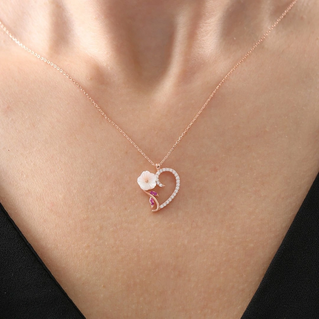 Kalp Demeti Manolya Çiçeği Flowers Gümüş Kolye