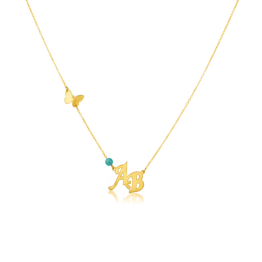 Sevginizi ve tarzınızı ifade etmenin en zarif yolu: İsim Harfli Kelebek Detaylı Gümüş Kolyemiz. Yüksek kaliteli 925 ayar gümüşten özenle üretilen bu özel kolye, kişiselleştirilmiş "AB" harfleriyle size veya sevdiklerinize anlamlı bir dokunuş katıyor. Zincir üzerindeki sevimli kelebek detayı ve canlı turkuaz boncuk, kolyeye modern ve şık bir hava katarken, her bakışta baharın enerjisini hissettiriyor.