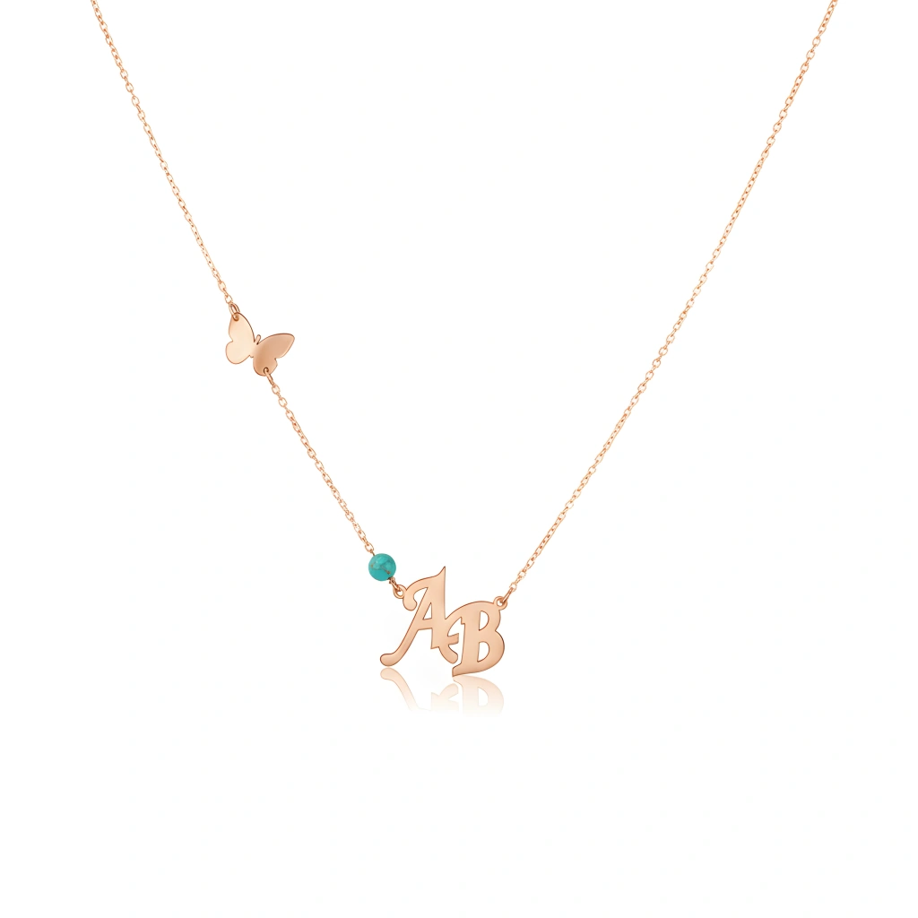 Sevginizi ve tarzınızı ifade etmenin en zarif yolu: İsim Harfli Kelebek Detaylı Gümüş Kolyemiz. Yüksek kaliteli 925 ayar gümüşten özenle üretilen bu özel kolye, kişiselleştirilmiş "AB" harfleriyle size veya sevdiklerinize anlamlı bir dokunuş katıyor. Zincir üzerindeki sevimli kelebek detayı ve canlı turkuaz boncuk, kolyeye modern ve şık bir hava katarken, her bakışta baharın enerjisini hissettiriyor.