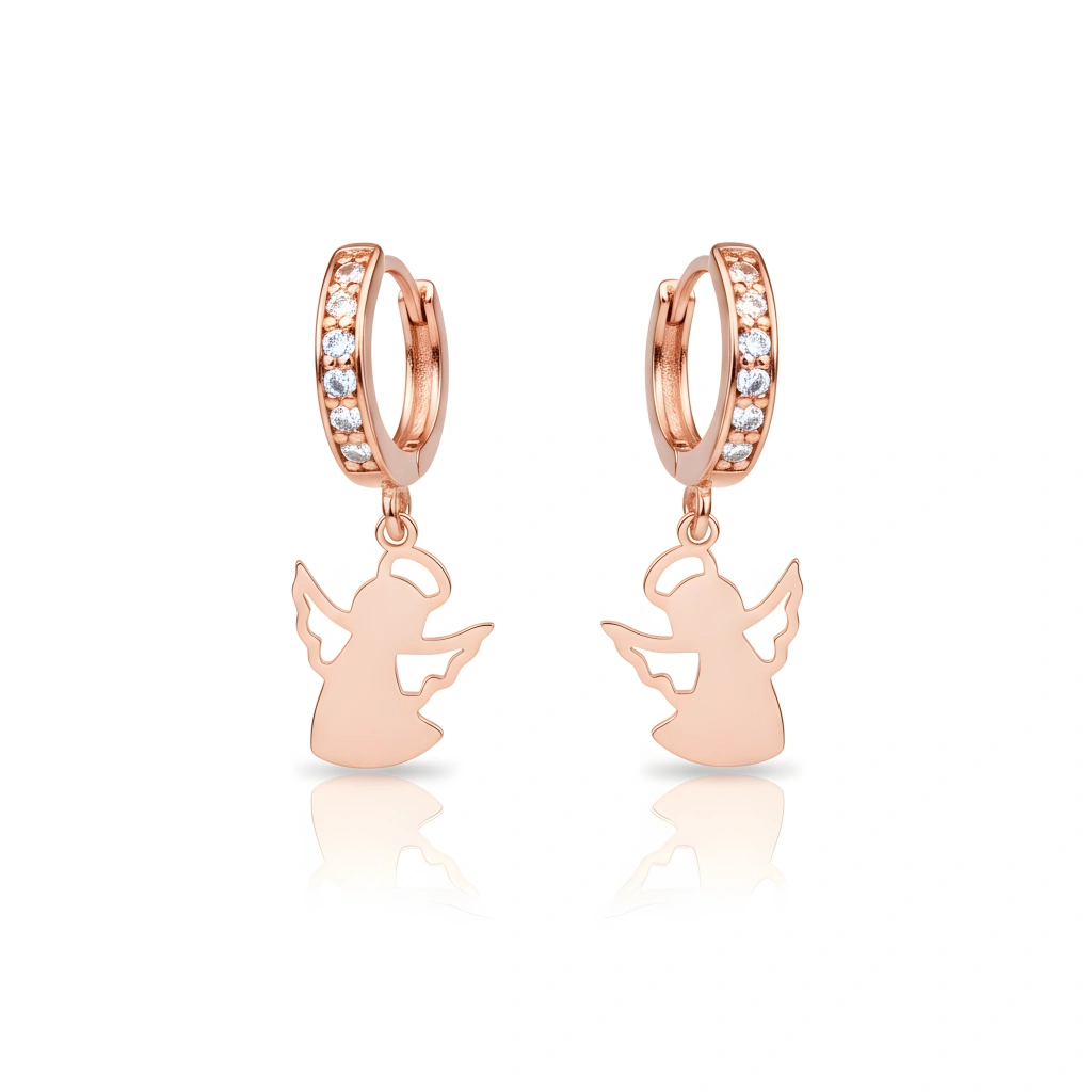 Küpe seti, yüksek kaliteli 925 Ayar Gümüşten üretilmiş olup, günümüzün en trend rengi olan ışıltılı Rose Altın Kaplama ile tamamlanmıştır. Küpenin iç kısmındaki melek figürünün hatları, parlak zirkon taşlarla bezenmiştir.
