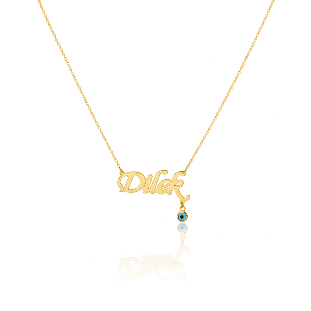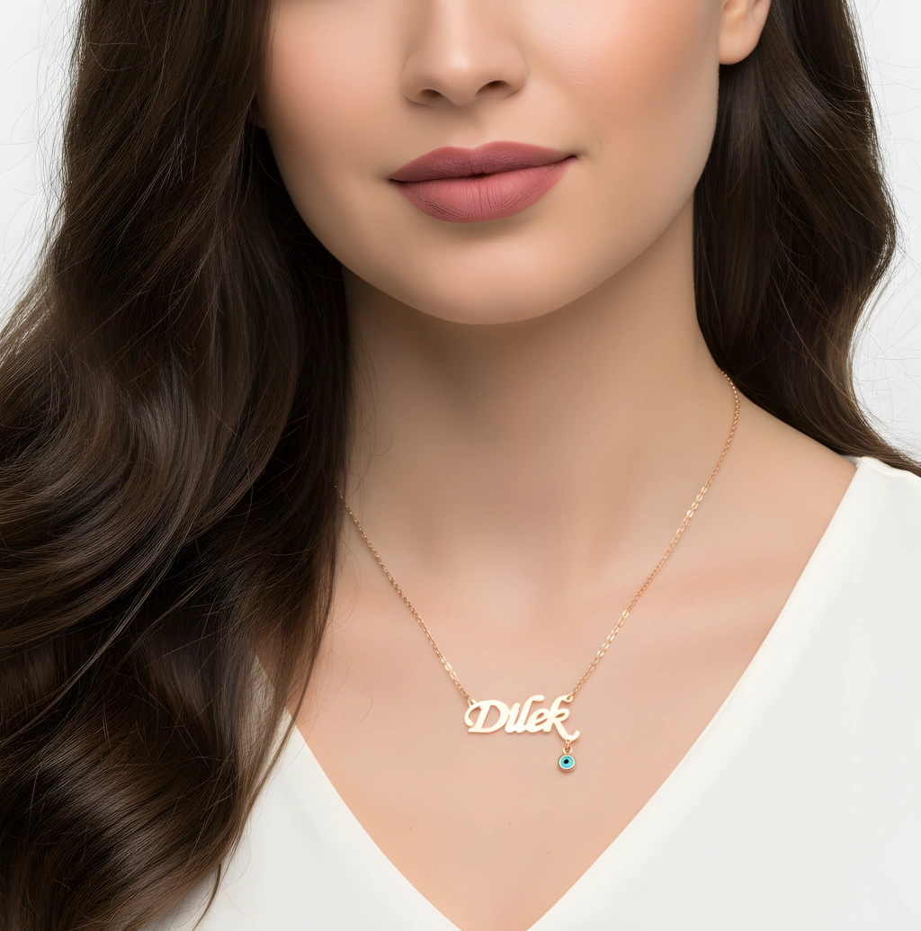 Özenle tasarlanmış yazı fontu, kolyeye modern ve şık bir hava katarken, dilerseniz ekleyebileceğiniz küçük nazarlık veya farklı bir sembolle kolyenizi daha da kişiselleştirebilirsiniz. Hafif yapısı sayesinde gün boyu konforlu bir kullanım sunan bu kolye, özel zincir kilidiyle de güvenliğinizi sağlar.