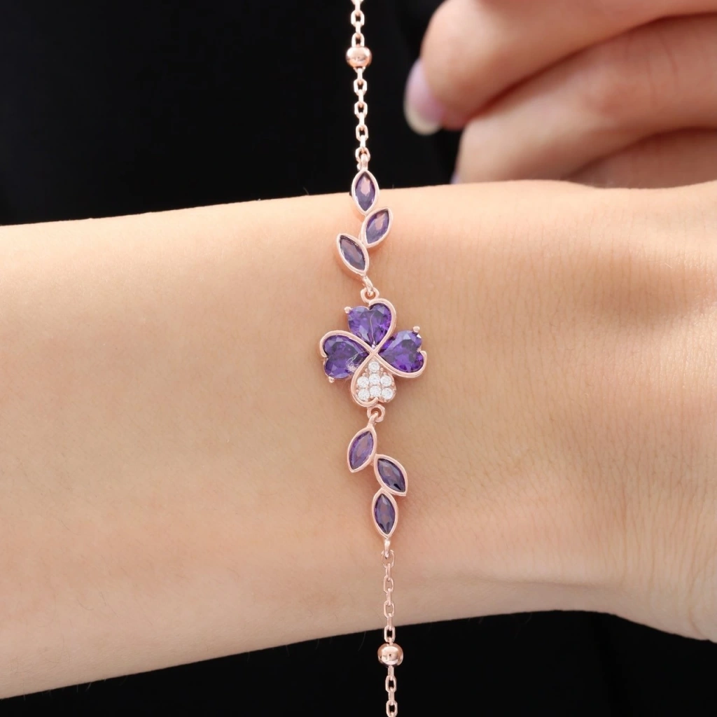 Pırlanta Montür Ametist Taşlı Kalp Yonca Form Gümüş Bileklik