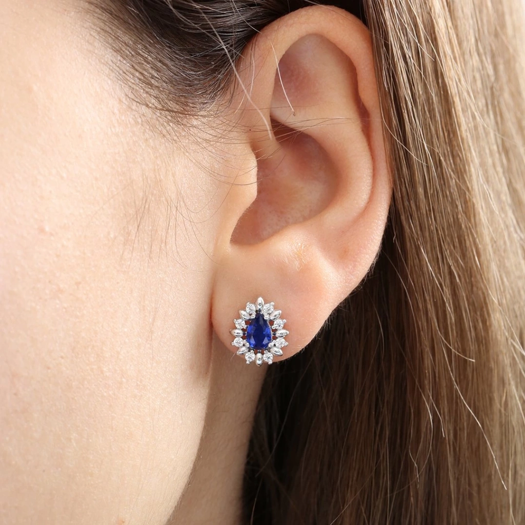 Pırlanta Montür Yağmur Tanesi Sentetik Safir Gümüş Küpe - Gümüş