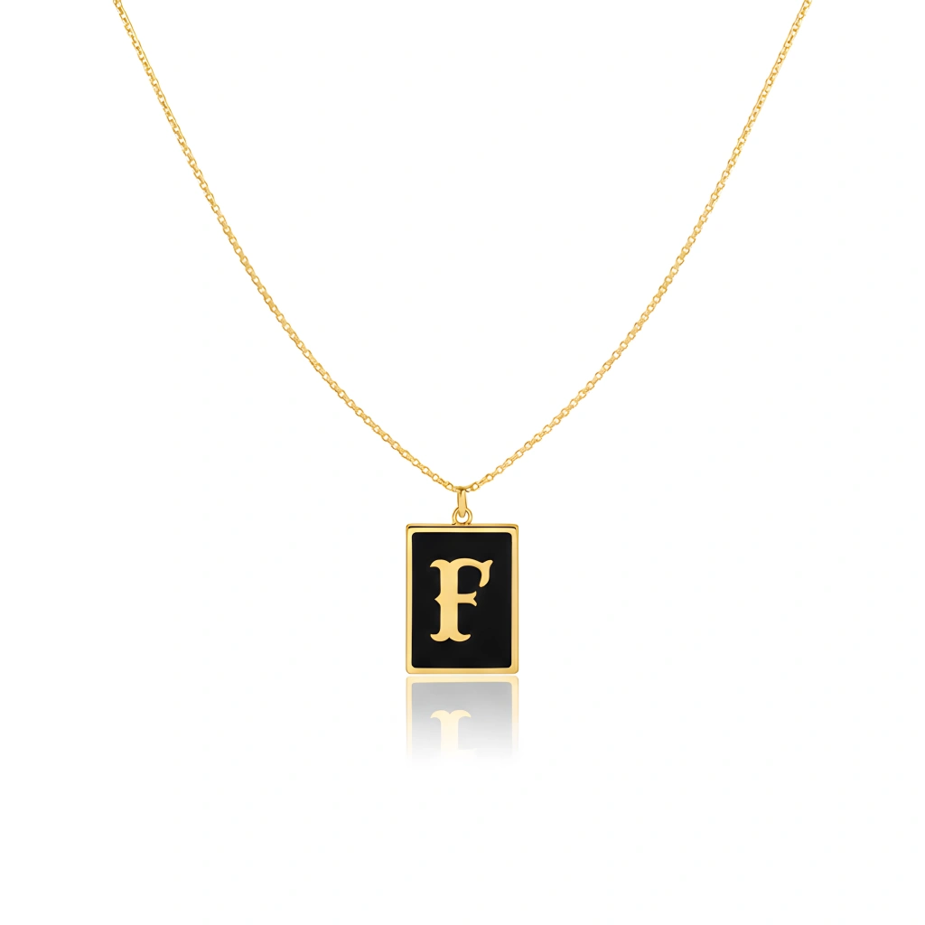 Bu kolye, yüksek kaliteli 925 Ayar Gümüşten üretilmiş olup, canlı ve sıcak bir görünüm için dayanıklı yüksek kaliteli altın kaplama ile tamamlanmıştır. Kolye ucundaki dikdörtgen plaka, çarpıcı bir kontrast yaratmak üzere parlak siyah mine (emaye) ile doldurulmuştur. Bu siyah zemin üzerinde, kolyeyi taşıyan kişinin baş harfini temsil eden, zarif ve dikkat çekici bir stilize harfi öne çıkar.