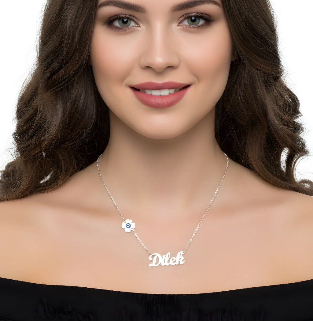Hayatınızdaki en değerli kişisel dokunuşlardan biri olan isminizi, şans ve zarafetle birleştirmeye hazır mısınız? Şanslı İsim 925 Ayar Gümüş Kolye, özel yazı fontuyla tasarlanan isminizin (örneğin 'Dilek' ismi) yanında, şans getiren dört yapraklı yonca figürü ve koruyucu nazar boncuğu detayıyla eşsiz bir kolye sunuyor. Bu kolye, sadece bir aksesuar değil, aynı zamanda size özel bir tılsım ve stilinizin ışıltılı bir yansımasıdır.