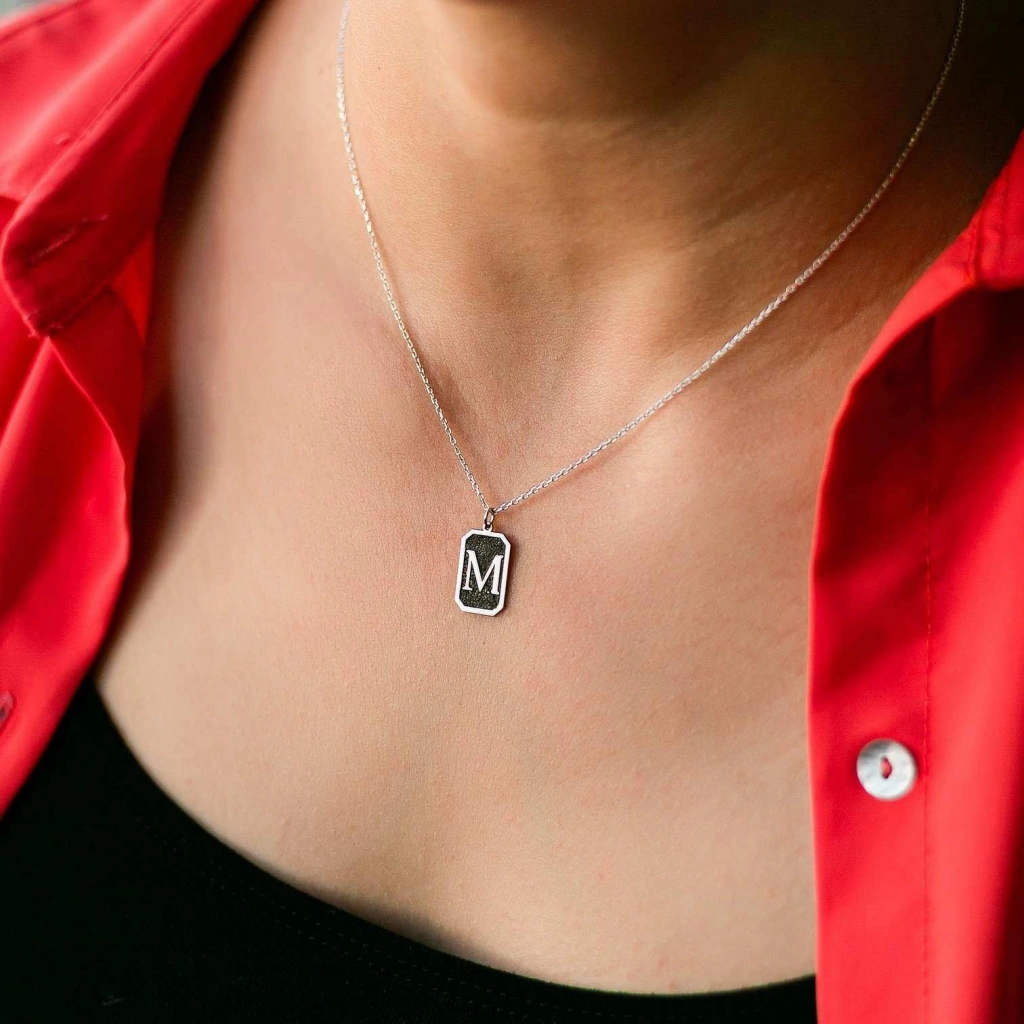 Siyah Kare Plaka Harf Gümüş Kolye - Gümüş