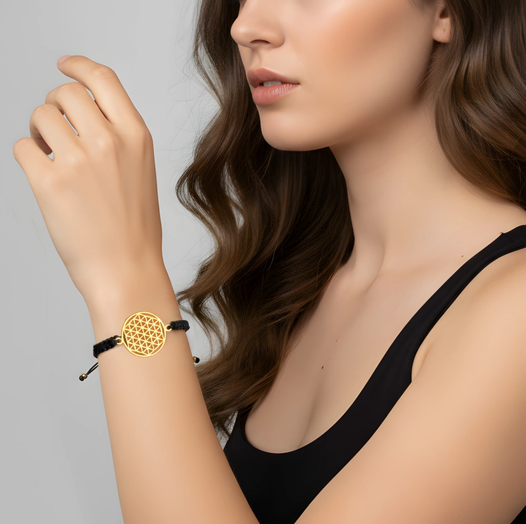 Tüm evrenin ve yaşamın temelini temsil eden, kutsal geometri sembolü "Yaşam Çiçeği" (Flower of Life) figürünü taşıyan bu özel bileklik, hem manevi derinliği hem de modern şıklığı bileğinizde birleştirir.