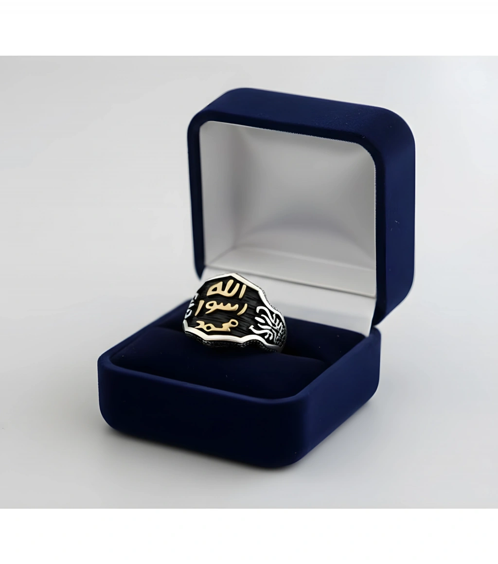 İnancın ve asaletin sembolü olan Mühr-ü Şerif, en kaliteli madenlerin birleşimiyle yeniden yorumlandı. Bu özel tasarımda, yüzüğün ana gövdesi yüksek kalite gümüşten, üzerindeki kutsal ibareler ise saf bronz madeninden işlenmiştir.