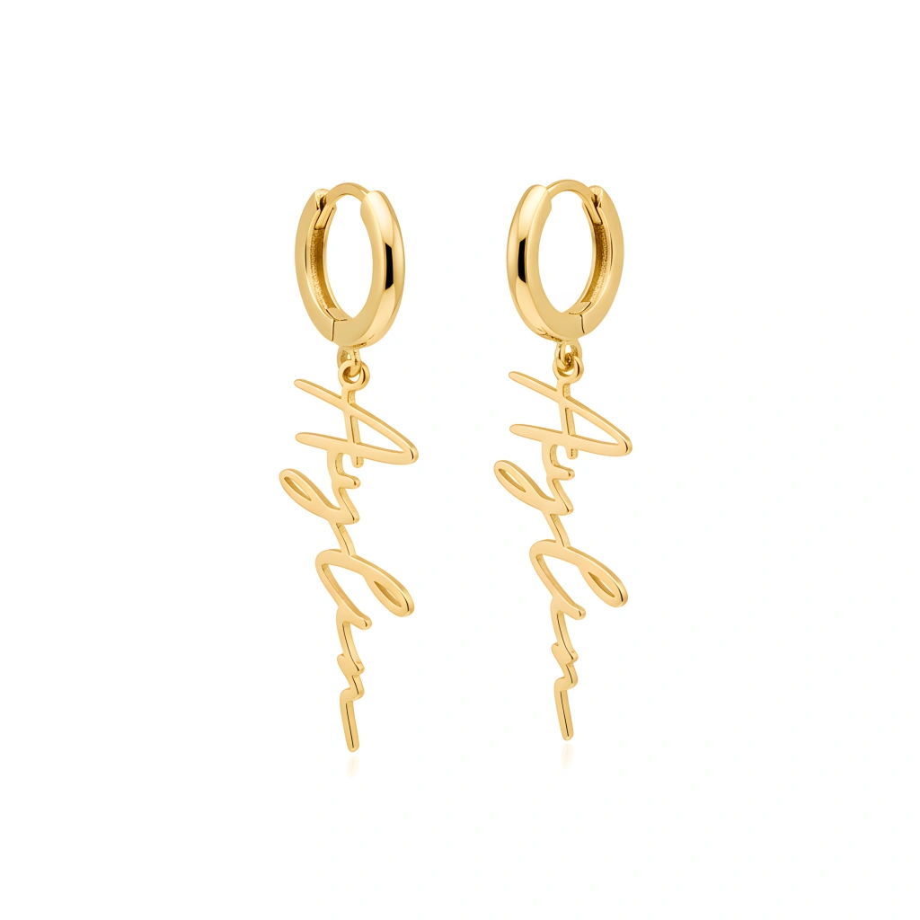• Benzersiz Tasarım: Küpenin sallantılı kısmında, el yazısı stiliyle oluşturulmuş, kişiye özel bir imza veya kelime (örneğin "Ayşe Can") bulunmaktadır. Bu eşsiz tasarım, ürünü sadece bir aksesuardan öte, anlamlı bir hatıraya dönüştürür.