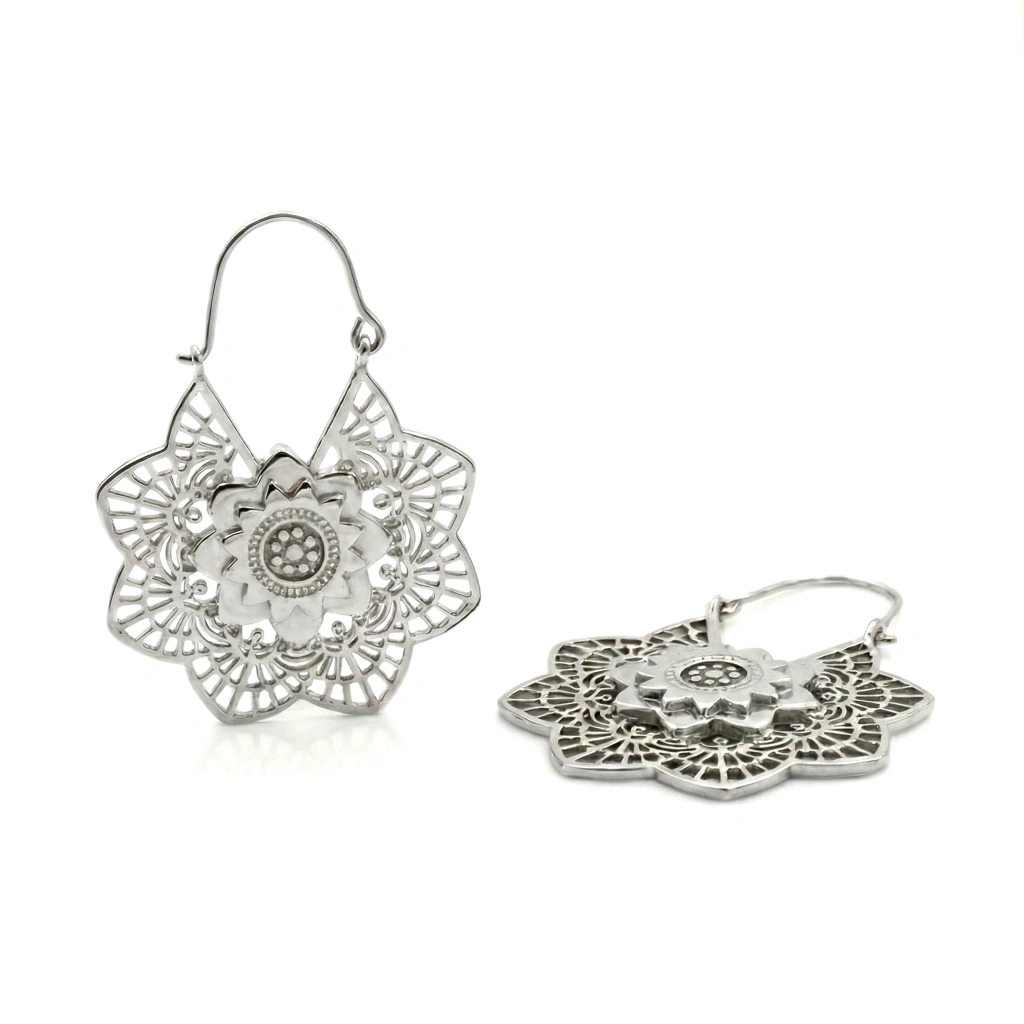 Tasarım Detayları: Merkezdeki kabartmalı lotus motifini çevreleyen dantel görünümlü ince işçilik, ışığı mükemmel bir şekilde yansıtarak kulağınızda zarif bir ışıltı yaratır. Geometrik çiçek formu ve bohem havası sayesinde hem günlük kombinlerinizde (bir kot bir tişörtle bile!) hem de şık akşam davetlerinde fark yaratmanızı sağlar.