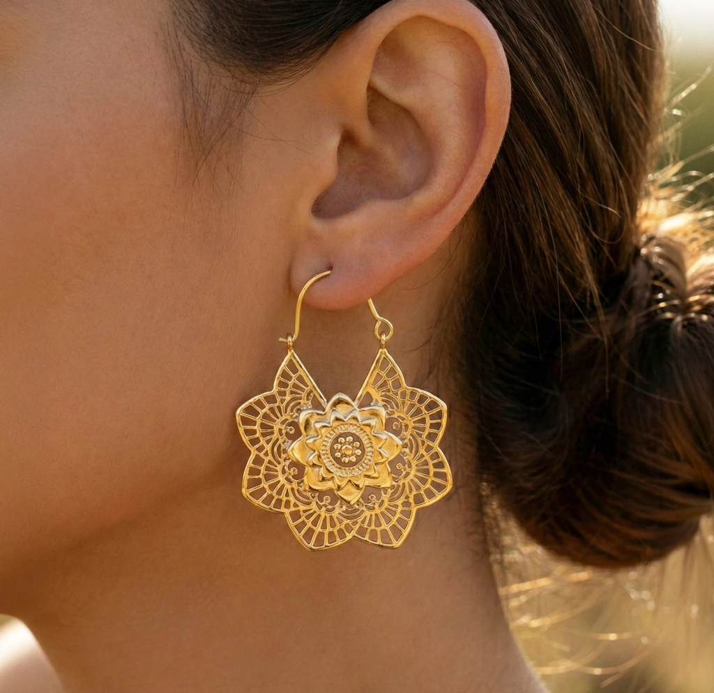 Altının zengin ve sıcak tonlarıyla, mistik lotus çiçeği tasarımının buluşması... Bu küpeler, gösterişi seven ve detaylara önem veren kadınlar için tasarlandı.