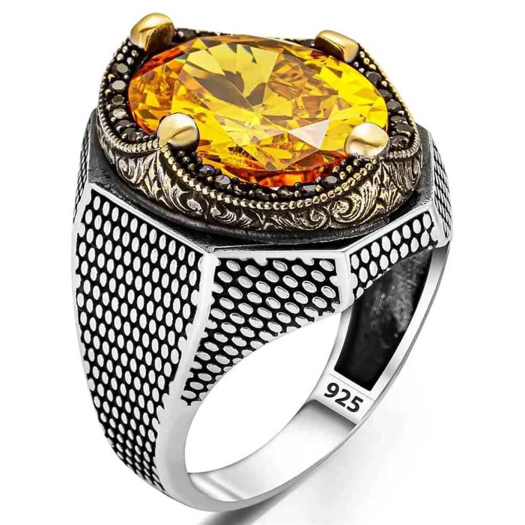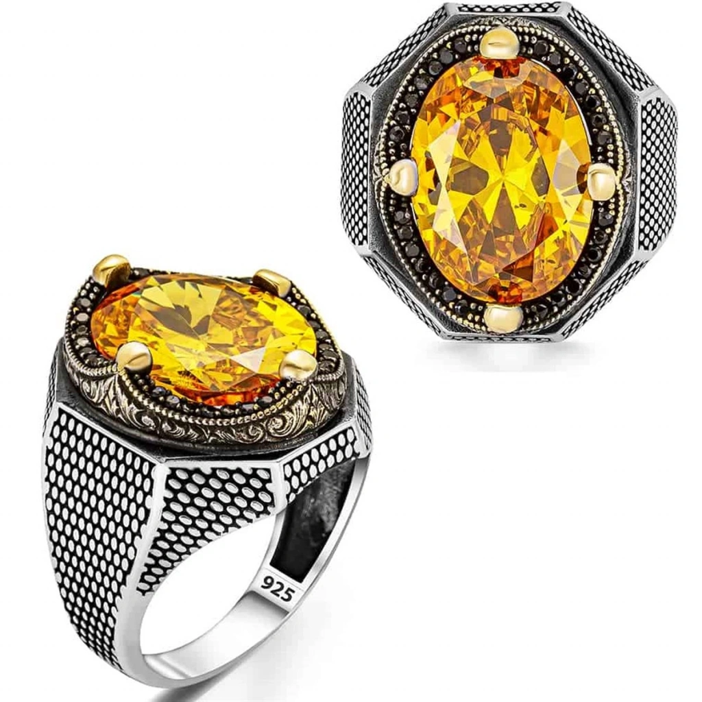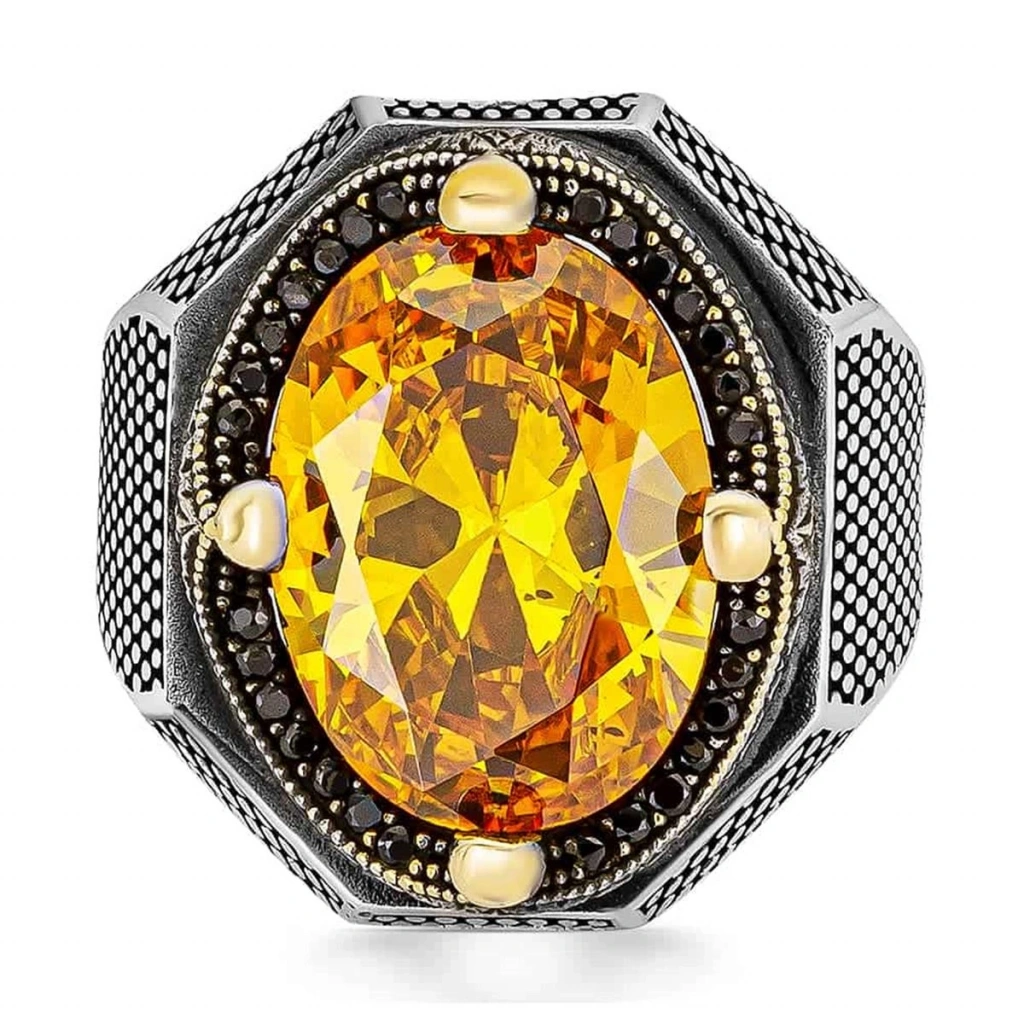 Göz Alıcı Sarı Zirkon Taşının Büyüsü Yüzüğün merkezinde, usta işi bir kesimle şekillendirilmiş, ışığı mükemmel bir şekilde yansıtan büyük boy sarı zirkon taşı yer alır. Pırlanta benzeri parlaklığıyla bilinen zirkon taşı, yüzüğe lüks ve prestijli bir hava katar. Taşın etrafını saran siyah mini zirkon taşlar ise kontrast oluşturarak ana taşın ışıltısını daha da ön plana çıkarır.