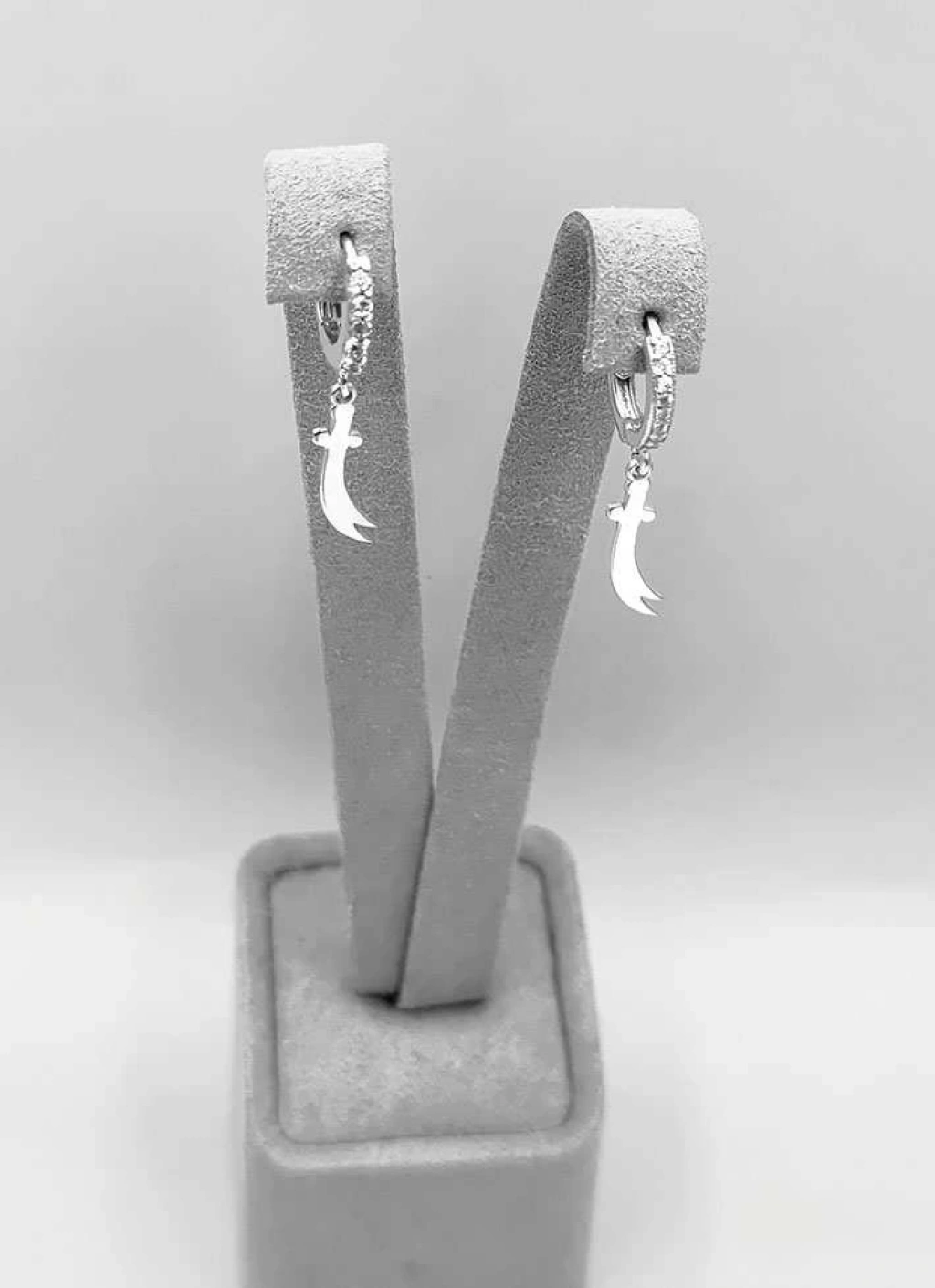 • Göz Alıcı Tasarım: Sallantılı kılıç figürü, parlak altın rengi (veya gümüş/rose altın rengi) ile dikkat çekerken, küpenin halka kısmı zarif bir sıra zirkon taş ile süslenmiştir. Bu detay, ürüne ışıltı ve lüks bir dokunuş katar.