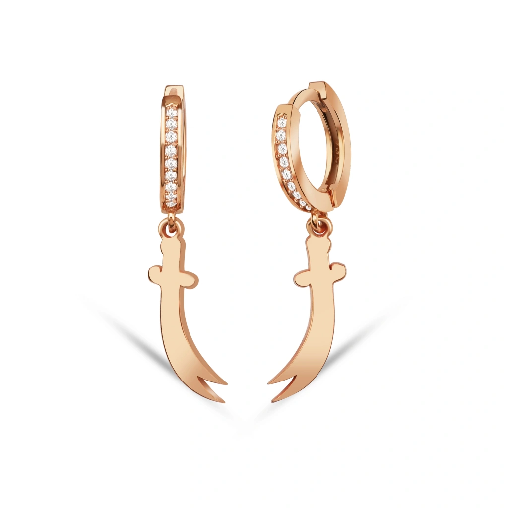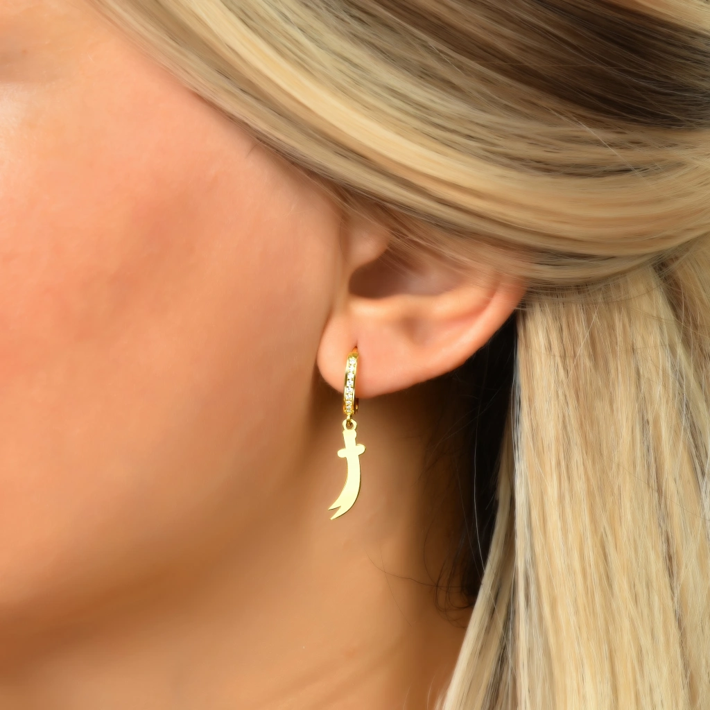 • Göz Alıcı Tasarım: Sallantılı kılıç figürü, parlak altın rengi (veya gümüş/rose altın rengi) ile dikkat çekerken, küpenin halka kısmı zarif bir sıra zirkon taş ile süslenmiştir. Bu detay, ürüne ışıltı ve lüks bir dokunuş katar.