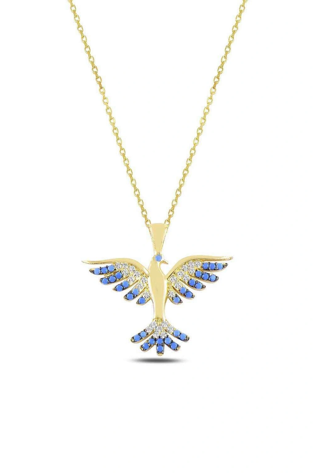 Zümrüdü Anka Kuşu Mavi Taşlı Gümüş Kolye - Altın